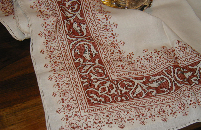 Nella foto: un esempio di tovaglia con ricamo artigianale Punto Assisi. Da accademiapuntoassisi.com.