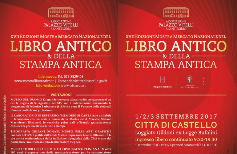 A Città di Castello (Valtiberina, Perugia, Umbria del Nord) dal Primo al 3 settembre 2017 la 17esima edizione tra libri rari e di pregio, litografie, fotografie, incisioni, cartografie... Con il borgo umbro capace di attirare 40 operatori dall'Italia e dall'estero, in una tre giorni densa di appuntamenti